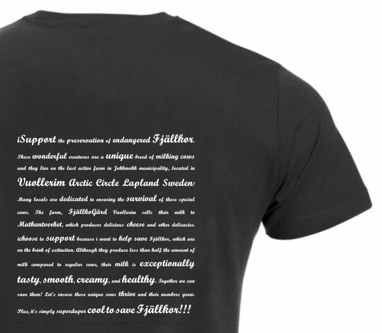 I support Fjällkor – en UNIK T shirt där allt överskott går oavkortat till bevarande av just Fjällkon!